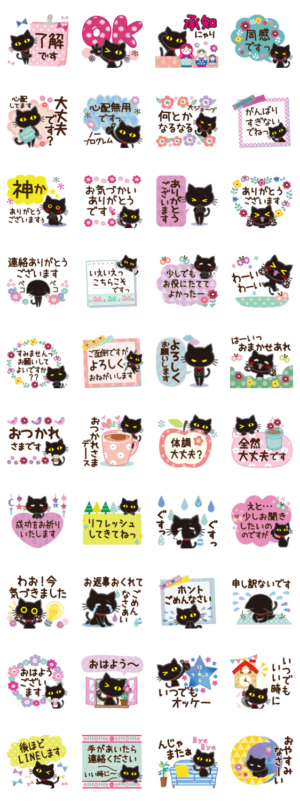 デフォルメされたくろねこの文字入りスタンプです。会話になじむ使いやすいスタンプとなっています。