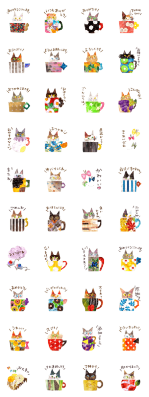 カップに入ったねこちゃんのスタンプ。全体的にアーティスティックな雰囲気で、他スタンプのような分かりやすさについては微妙だが、ねこちゃんやカップのデザインが美しく、好きな人はとことん好きになれる作品。