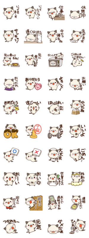 しゃむ猫の『ちびシャム』。『絵文字』と『着せかえ』もあります。家族等、親しい友人や、恋人等の連絡用に使えるネコスタンプ。シャムねこ好きな方にぜひ。【かたこ】