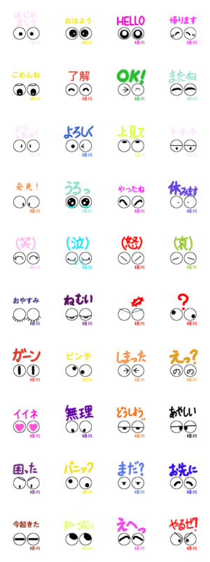 かわいい目玉の日常会話・あいさつ・気持ち 了解 はじめまして おはよう HELLO 帰ります ごめんね またね どうしたの? よろしく 上見て OK トホホ 今起きた