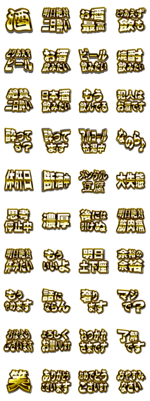 超金ピカでゴージャスなゴールドでか文字シリーズ、金文字で激アツに伝えます、おはようからおやすみ、毎日使える日常会話など、お酒ネタを中心に豪華に伝えます