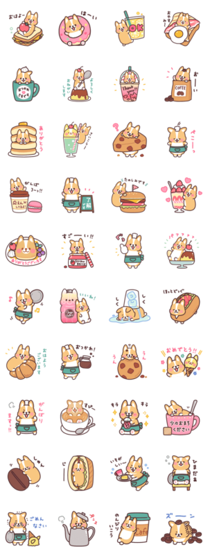 カフェがテーマのまるまるコーギースタンプです。プリンやパンケーキなどスイーツにパン、コーヒーやクリームソーダなどのドリンクも盛りだくさん!カフェで働くコーギーも!つじなつみ より発売