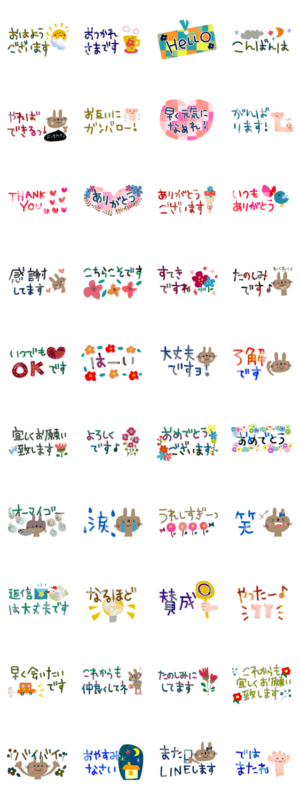 省スペースで文字大きめメッセージが読み易く、ポップでカラフルな大人スタンプ。鳥やウサギお花など北欧テイストも織り交ぜました。気遣い込めた毎日使えるスタンプです。