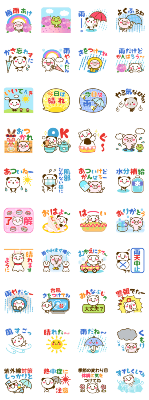 おてんき❤雨 梅雨 台風 晴れ 初夏❤動物天気スタンプ❤ 挨拶に天気で会話が続く!No.2❤晴れ/雨/くもり等と 暑い/初夏の季節入り!パンダ/ねこ/ブタ❤作:usakazu1