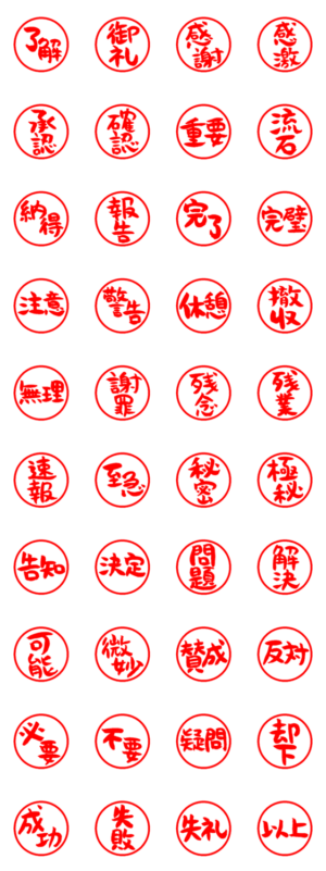 スタンプだけでも気持ちが伝わるユル文字はんこ。仕事編。年上の方にも使える2文字のシンプルな手書き筆文字スタンプです。Osushi より発売