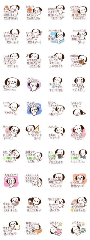 わんこの長文スタンプ。文字が読みやすいよう配慮されており、長文スタンプにありがちな見づらさがない。キャラも邪魔になっていないし、いい引き立て役になっている。