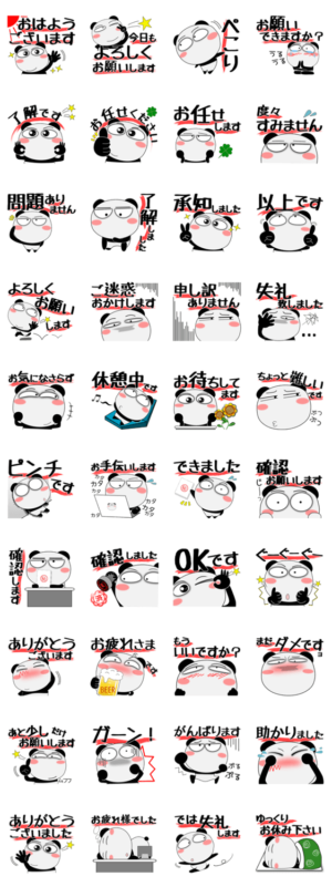 パンダのデカ文字。毎日よく使う言葉、敬語がそろっています。どちらかというと社会人向け。文字が大きくて見やすい!使いやすい!わかりやすい!の3拍子揃ったスタンプ。