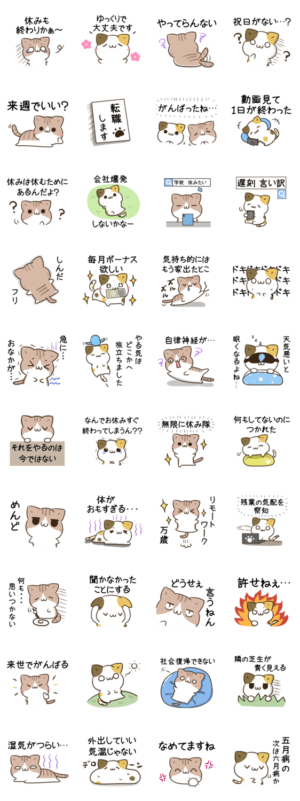 お疲れ気味やる気が出ない時に使えるゆるかわ三毛猫とキジトラ白猫のスタンプ第7弾 仕事 締め切り 進捗 社畜 気づかい 気圧 春夏秋冬 梅雨 敬語 学校 体調不良