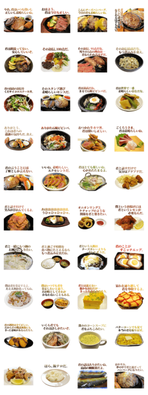 すべてを肯定する美味しそうな食べ物のスタンプです。肯定すればみんな幸せ。深夜に送るのは禁止です。ハンバーグ、ステーキ、ビビンバ、お刺身、もつ鍋、実写面白い食べ物竹野チコ より発売