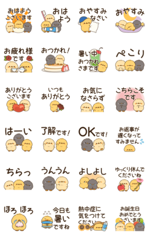 男女問わず使いやすい、毎日の挨拶やお返事に便利なヒヨコたちの飛び出すスタンプです。夏の挨拶もあります♪