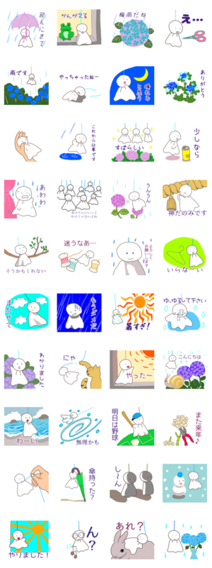 雨の日を楽しむ、てるてるぼうずと紫陽花のスタンプです。梅雨や天気、傘、あじさい、カエル、カタツムリなど。かわいいてるてる坊主の癒しスタンプです。