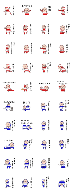 いつもの面白スタンプ(赤と青のストライプタイツ)「ありがとう」と「ごめんなさい」。あったほうがいいスタンプ
