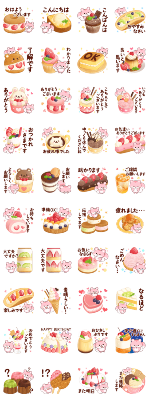 様々なスイーツとリス。日常会話で役に立つ毎日使いやすいスタンプです。毛玉ピストル より発売