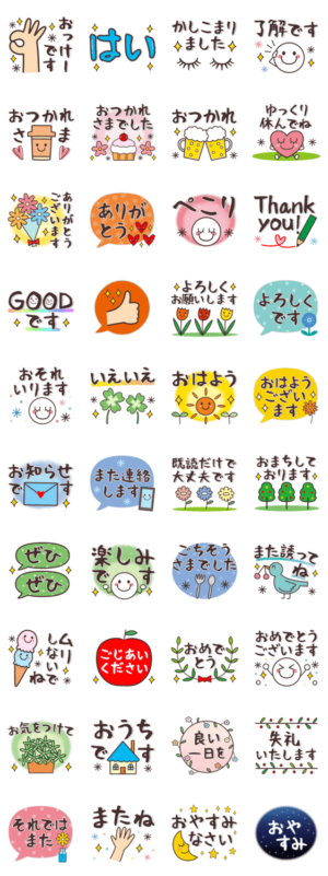 大きめな文字で見やすい、シンプルでかわいいスタンプです。敬語が中心で、どなたでも使いやすい内容となっています。HRYs より発売