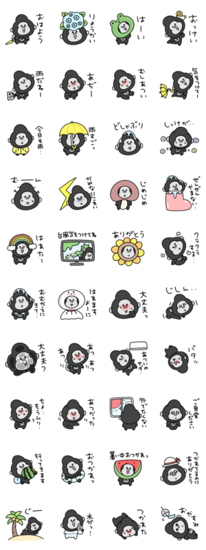 シュールなミニゴリラの梅雨〜夏のスタンプです。eribo より発売