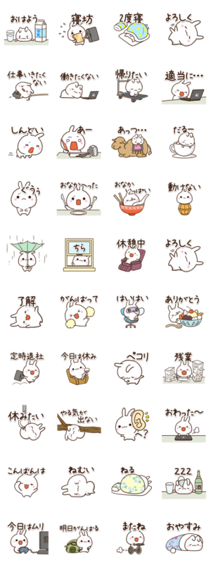 小さいウサギのスタンプ。だるいときや、やる気が出ないとき等に便利です。毎日使える言葉等も集めたスタンプです。白いうさぎ好きの方にぜひ。【かたこ】かたこ より発売