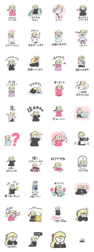 優しい雰囲気の、女の子のスタンプ。かわいすぎずキラキラしすぎずという点が使いやすい。メッセージの汎用性も良好。しかし一部個性的なものもあり、全体的に良い作品としてまとまっている。