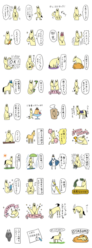 ゆるやかな敬語のスタンプです。褒め言葉が豊富で、いろいろな返信に使用できるシンプルさ。競馬・乗馬・馬好き同士の会話にも、そうでない人にもぜひどうぞ。