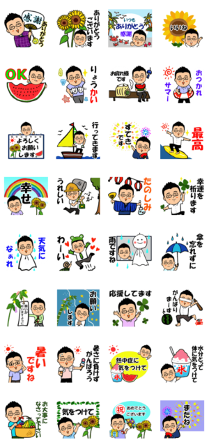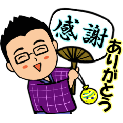 笑顔のサラリーマン(眼鏡あり)シリーズ。今回は夏に使えるスタンプ。見やすいデカ文字挨拶付き。梅雨、七夕、祭り、浴衣、男性、めがね、爺、季節、イベント、行事、サマー