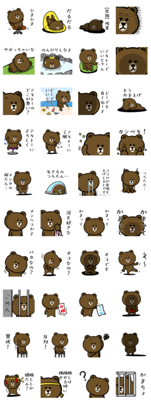 ブラウン&フレンズの無気力スタンプ。だるい.しんどい.ひま.仕事嫌い.遊びたい.つらい.テキトー.適当.サボり.メンヘラ.つらたん.かまちょ.やる気ないヒトに☆ノンノノン作 ※BROWN & FRIENDS をみんなでつくろう!キャンペーン参加スタンプですノンノノン より発売