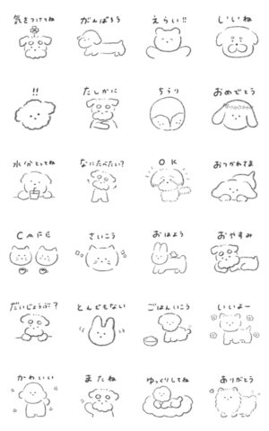 やさしい言葉をかけたい時に使えるどうぶつたち のスタンプです。(わんちゃん多め) いぬ/わんちゃん/白/かわいい/手描き/ほっこり/うさぎ/猫/ねこ/シュナウザー/くま