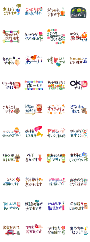 省スペースでメッセージが読み易く、ポップでカラフルな敬語スタンプ。鳥や熊、気遣い込めた毎日使えるスタンプです。
