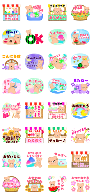 【夏】スタンプ/クマ/熊/祭/屋台/スイカ/海/ほんわか/かわいい/承知致しました/了解/ありがとう/よろしく/お大事にしてください/mamama-chin