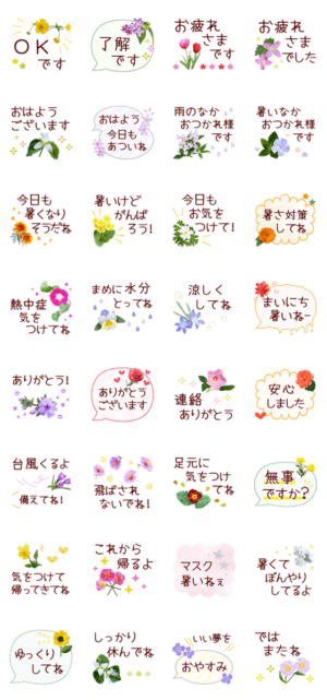 暑い日に便利なやさしい気持ちがつまったスタンプです。毎年6月7月8月9月におこりがちな熱中症や梅雨や台風に注意してねなど。大人かわいい癒しのフラワーを添えてjabo より発売