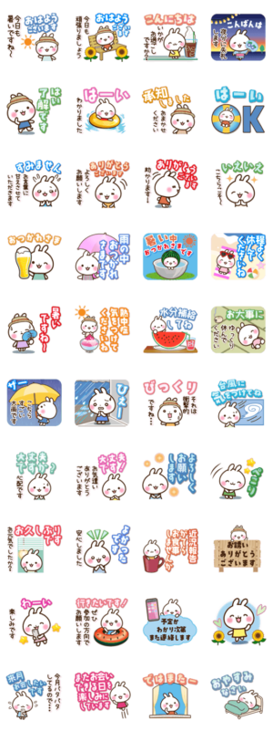 夏に便利なうさぎさんの丁寧な挨拶や敬語のスタンプです。食事の誘いや連絡にも使えます。雨の日、暑い日にも送れて便利なスタンプです♪