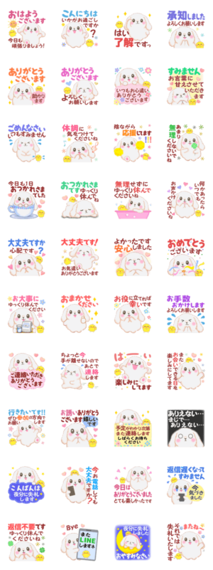 気づかいや挨拶、敬語。日常よく使う長文のメッセージを集めた たれみみのうさぎさんのスタンプです♪めぐみん より発売