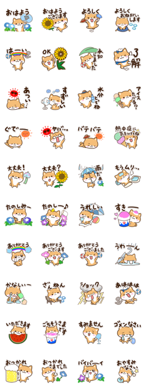 ちいさい柴犬の豆柴。『まめシバ』の【絵文字】と【着せかえ】もあります。夏の雰囲気のイヌスタンプ。いぬ好きの方、コーギーや秋田犬を飼っている方にぜひ。【かたこ】かたこ より発売