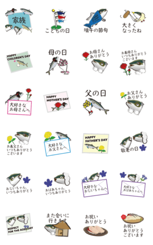 こどもの日、母の日、父の日、敬老の日ブリ(家族の日ブリ)。香川県出身鰤シリーズ。こどもの日、母の日、父の日、敬老の日に使えるポップアップスタンプ。