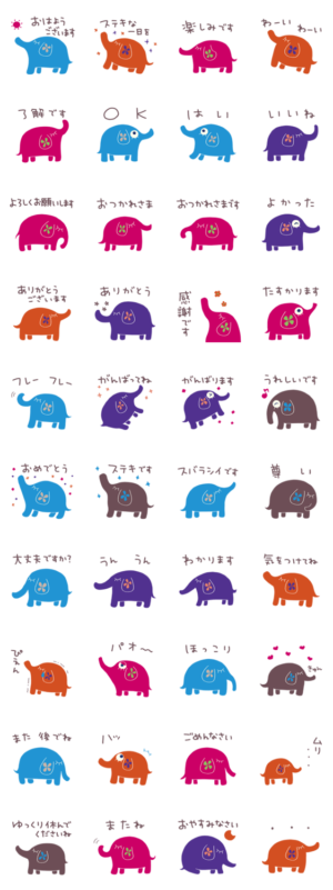 カラフルな彩りのゾウのパレットが新登場。「了解です」「おつかれさま」から「ありがとうございます」まで。ゾウのパレットと一緒に、日常のあいさつを楽しく届けよう。Mami / エストループ より発売
