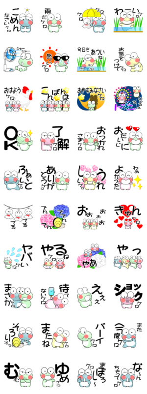 梅雨と夏の時期に使いたくなる心温まるスタンプです。どのカエルも可愛らしくて素敵ですね。