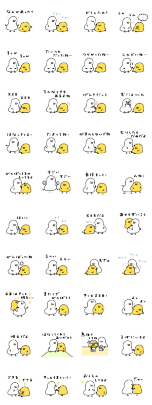 ぽよぽよぷよぷよした感じのあひる・ひよこのスタンプ。へんてこと説明されているがクセはそこまで強くない。むしろポップな絵柄として考えれば普通の域。全体的に励ましのメッセージが多い。