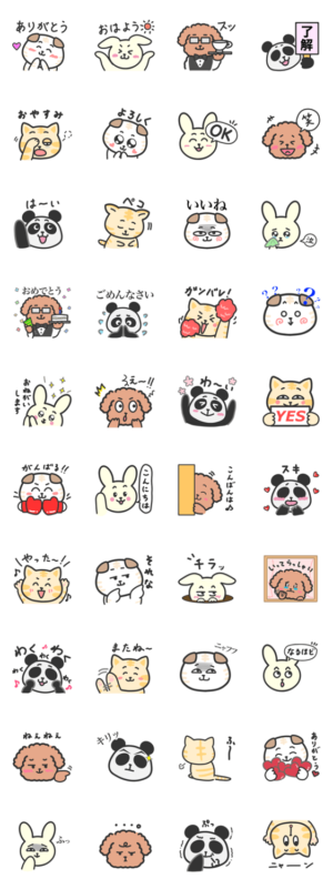 絵文字シリーズのMr.ゆるぱんだ、ゆるねこ、ゆるいぬ、ゆるうさぎ達が大集合しました。かわいいけれど、やっぱり悪い顔も…。日常で使いやすい?スタンプです。