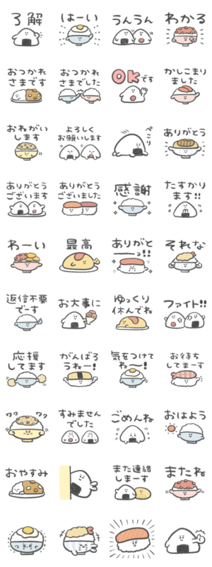 ご飯物いっぱい集まりました。日常用。お寿司/オムライス/丼物/いくら/卵かけご飯/ゆるかわ/デカ文字スタンプ/あいさつスタンプ/oroninet