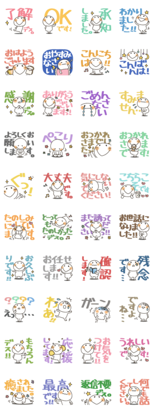 まるぴの第11弾、丁寧語バージョンです。餅みたいなスマイルくんの、文字大きで見やすく目立つ、老眼、先輩、上司、ママ友、会社グループでおすすめ!気遣いのスタンプ。かなぴ より発売