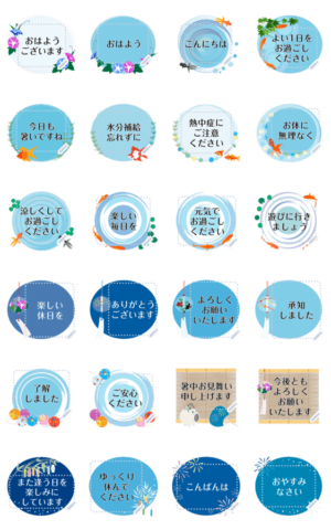 金魚や風鈴・朝顔・七夕・花火、夏のフレームいろいろ。好きなテキストを自由に入力して、夏の挨拶やおしゃべりにご利用ください。 現在この商品は一部のスマートフォン版LINE 10.3.0以上のトークルームでのみ使用できます。動作環境の最新情報はヘルプをご確認ください。acacia より発売