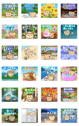 背景までしっかりと夏を感じさせる、ねこちゃんとハムちゃんのスタンプ。夏以外には使いづらいが、どれも丁寧に作り込まれている。