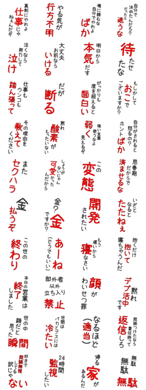 面白い煽り言葉やネタ・名言を集めました。BIGサイズですので送った相手により面白さが伝わると思います。是非使ってみてください。 ※このスタンプはトークルームで大きく表示されるBIGスタンプです。まじ恋lovers より発売