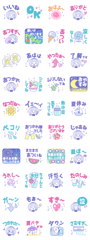 大人かわいい女の子5デカ文字 暑い夏、夏の日常(タメ語 敬語)、暑中お見舞い、残暑お見舞い、熱中症等!夏に便利なスタンプがいっぱい!❤作:usakazu1