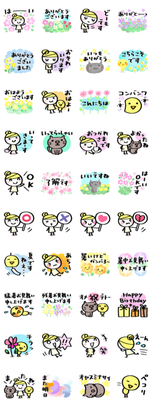 文字が大きくて見やすい、シンプルでサクっと送れる40個。花いっぱい、さわやかな涼しい色のほっこり優しいスタンプです。暑中見舞い、残暑見舞いなど夏にとても便利です。