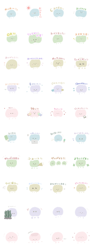 ゆるくて、カラフルなくらげたち。チャームポイントは大福に似てるとこ。友達・家族・恋人との会話にくらげはいかかですか?【日常会話・敬語・勉強・クラゲ・かわいい】