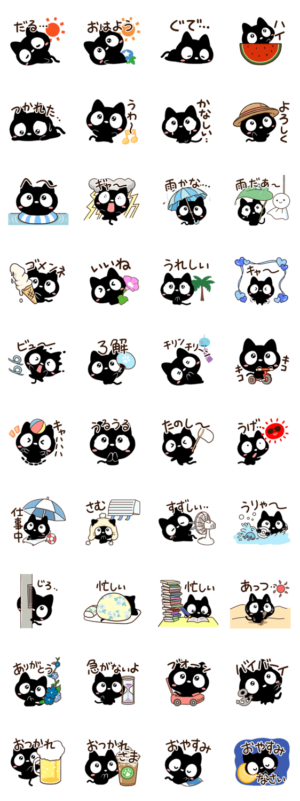 目が大きい黒猫のスタンプ。セリフも簡潔と平仮名が多いで小さい子相手でも使えそう。