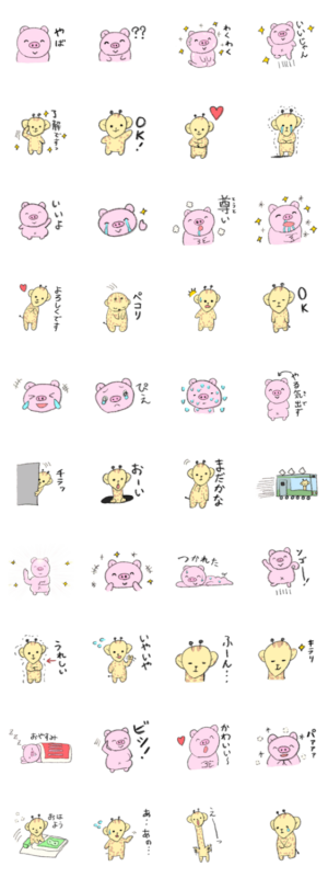 毎日の会話で使いやすいスタンプです。豚は危ういものの楽しく生きている素直オタク、きりんは不器用ながらもがんばって社会に適応しています。共に生物学的には女性です。