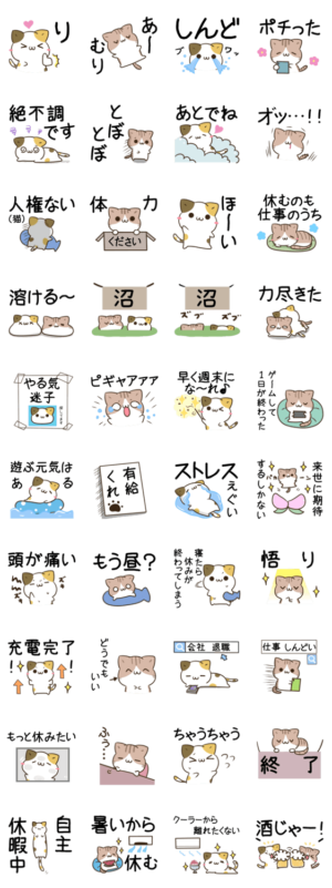お疲れ気味やる気が出ない時に使えるゆるかわ三毛猫とキジトラ白猫のスタンプ第8弾 仕事 進捗 社畜 気づかい 春夏秋冬 敬語 学校 体調不良 熱中症 でか文字 ストレスつきしろ より発売