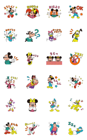 レトロタッチのミッキー&フレンズのアニメーションスタンプ登場!ビンテージっぽいポップな色合いがとってもキュート!会話を楽しく彩ってくれます♪