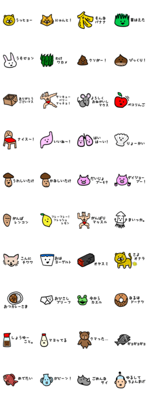ゆるいイラストのダジャレスタンプ。省スペースのSサイズはトーク画面でも場所を取らず、他のメッセージがたくさん表示されるからとっても便利!ブラフデザイン より発売