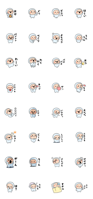 「ぐっ」「ぺこり」「ピシッ」「ドキドキ」「わくわく」「わーい」「キュン」「ちゅ」「ニヤッ」「がーん」「ちーん」などのシンプルなオノマトペ(擬音)スタンプです。